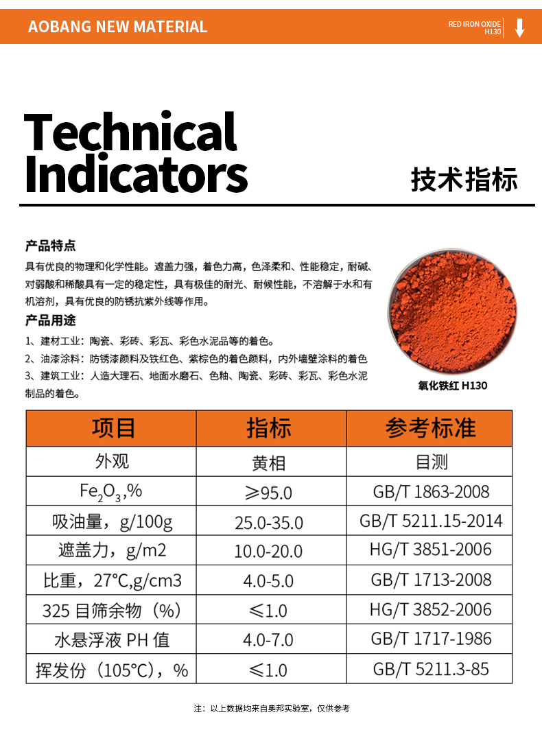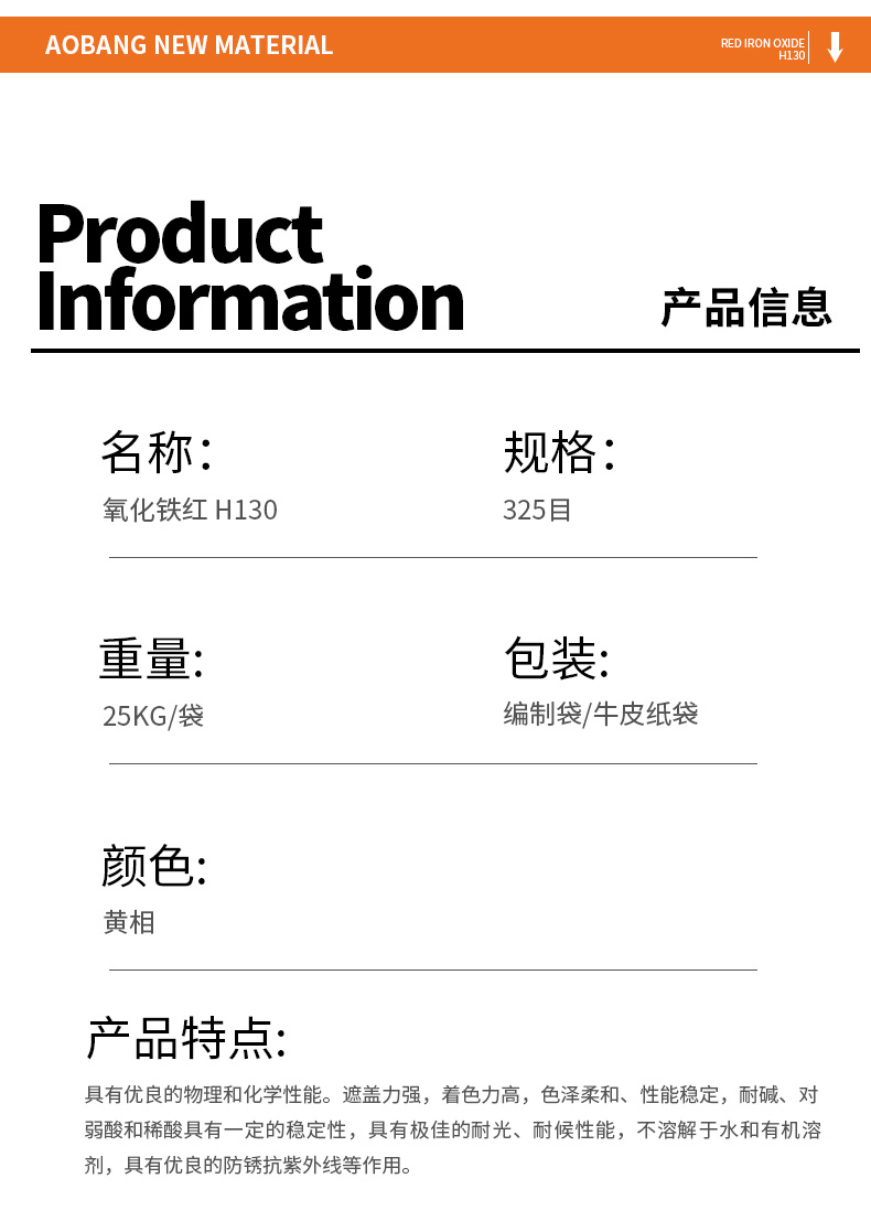 具有优良的物理和化学性能。遮盖力强,着色力高,色泽柔和、性能稳定,耐碱、对弱酸和稀酸具有一定的稳定性,具有极佳的耐光、耐候性能,不溶解于水和有机溶剂,具有优良的防锈抗紫外线等作用。